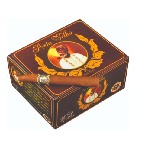 Charuto Preto Velho é feito a mão individualmente, manufaturados com folhas médias, bitola Petit Cetro, capa clara e escura, Disponivel em um Box de Papelão com 50 unidades.